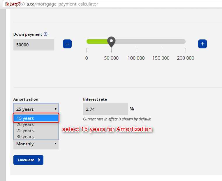 8. Change the Down Payment to 50 000 using the + button of the slider